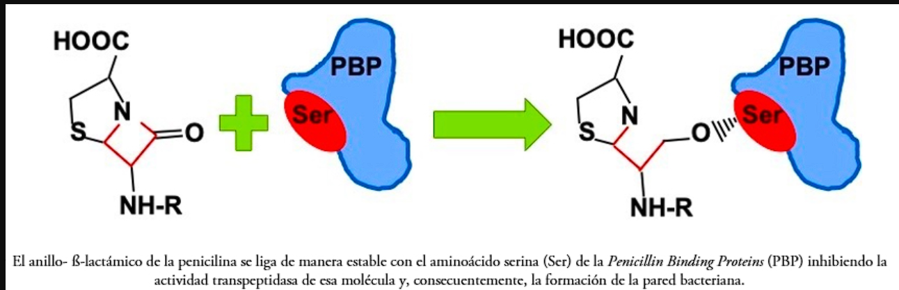 La penicilina (y otros β-lactámicos) actúa uniéndose a la serina del sitio activo de las PBPs de S. pneumoniae.