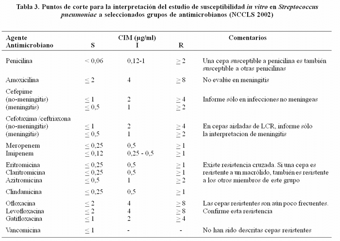 Los puntos de corte para definir susceptibilidad y resistencia de S. pneumoniae a penicilina por CIM siguen siendo los mismos: una cepa con CIM de < 0,06 µg/ml es susceptible, con CIM de 0,12 a 1,0 es intermedia y con una CIM de > 2 µg/ml es considerada resistente a penicilina. Si un neumococo es susceptible a penicilina, debe ser considerado susceptible también a otras penicilinas.